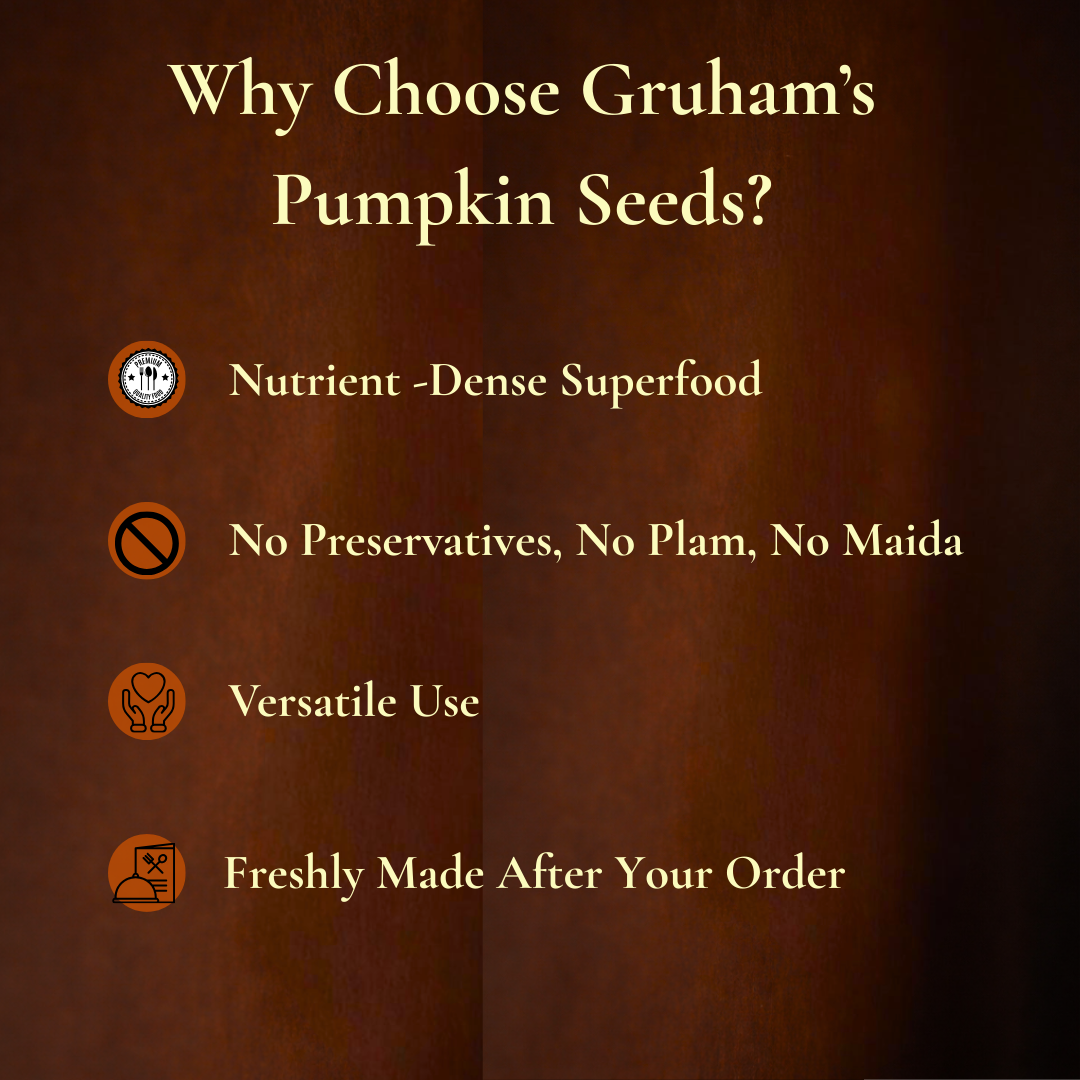 Gruham’s Pumpkin Seeds are lightly salted, roasted seeds packed with nutrition and crunch — a clean, everyday super-snack you can feel good about.